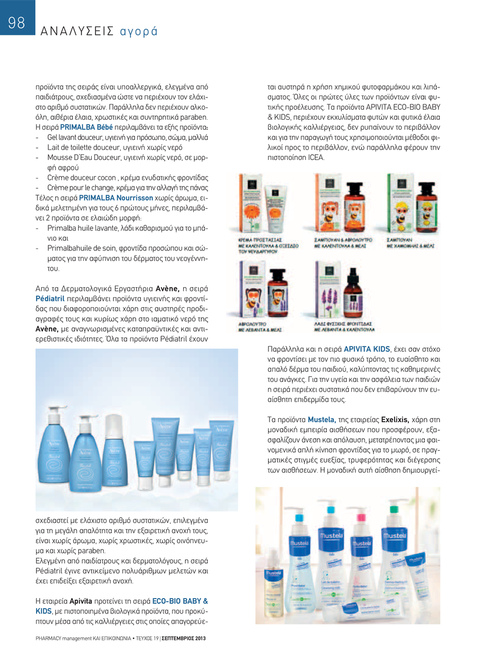 σχεδιαστεί με ελάχιστο αριθμό συστατικών, επιλεγμένα για τη μεγάλη απαλότητα και την εξαιρετική ανοχή τους, είναι χωρίς άρωμα, χωρίς χρωστικές, χωρίς οινόπνευμα και χωρίς paraben. Ελεγμένη από παιδίατρους και δερματολόγους, η σειρά Pédiatril έγινε αντικείμενο πολυάριθμων μελετών και έχει επιδείξει εξαιρετική ανοχή. Η εταιρεία Apivita προτείνει τη σειρά ECO-BIO BABY & KIDS, με πιστοποιημένα βιολογικά προϊόντα, που προκύπτουν μέσα από τις καλλιέργειες στις οποίες απαγορεύεPHARMACY management KAI EΠΙΚΟΙΝΩΝΙΑ • ΤΕΥΧΟΣ 19 | ΣΕΠΤΕΜΒΡΙΟΣ 2013