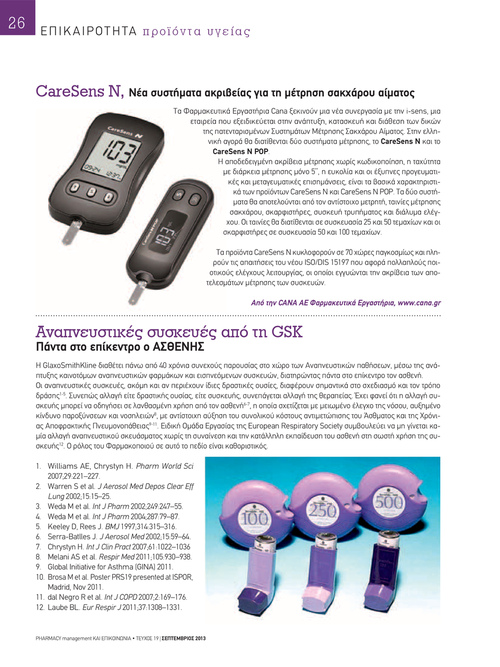 Η GlaxoSmithKline διαθέτει πάνω από 40 χρόνια συνεχούς παρουσίας στο χώρο των Αναπνευστικών παθήσεων, μέσω της ανάπτυξης καινοτόμων αναπνευστικών φαρμάκων και εισπνεόμενων συσκευών, διατηρώντας πάντα στο επίκεντρο τον ασθενή. Οι αναπνευστικές συσκευές, ακόμη και αν περιέχουν ίδιες δραστικές ουσίες, διαφέρουν σημαντικά στο σχεδιασμό και τον τρόπο δράσης1-5. Συνεπώς αλλαγή είτε δραστικής ουσίας, είτε συσκευής, συνεπάγεται αλλαγή της θεραπείας. Έχει φανεί ότι η αλλαγή συσκευής μπορεί να οδηγήσει σε λανθασμένη χρήση από τον ασθενή6-7, η οποία σχετίζεται με μειωμένο έλεγχο της νόσου, αυξημένο κίνδυνο παροξύνσεων και νοσηλειών8, με αντίστοιχη αύξηση του συνολικού κόστους αντιμετώπισης του Άσθματος και της Χρόνιας Αποφρακτικής Πνευμονοπάθειας9-11. Ειδική Ομάδα Εργασίας της European Respiratory Society συμβουλεύει να μη γίνεται καμία αλλαγή αναπνευστικού σκευάσματος χωρίς τη συναίνεση και την κατάλληλη εκπαίδευση του ασθενή στη σωστή χρήση της συσκευής12. Ο ρόλος του Φαρμακοποιού σε αυτό το πεδίο είναι καθοριστικός. 1. Williams AE, Chrystyn H. Pharm World Sci 2007;29:221–227. 2. Warren S et al. J Aerosol Med Depos Clear Eff Lung 2002;15:15–25. 3. Weda M et al. Int J Pharm 2002;249:247–55. 4. Weda M et al. Int J Pharm 2004;287:79–87. 5. Keeley D, Rees J. BMJ 1997;314:315–316. 6. Serra-Batlles J. J Aerosol Med 2002;15:59–64. 7. Chrystyn H. Int J Clin Pract 2007;61:1022–1036 8. Melani AS et al. Respir Med 2011;105:930–938. 9. Global Initiative for Asthma (GINA) 2011. 10. Brosa M et al. Poster PRS19 presented at ISPOR, Madrid, Nov 2011. 11. dal Negro R et al. Int J COPD 2007;2:169–176. 12. Laube BL. Eur Respir J 2011;37:1308–1331.