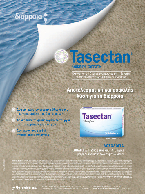 OΔHΓIEΣ XPHΣHΣ. ο Tasectan είναι ένα ιατροτεχνολογικό προϊόν, που χρησιµοποιείται για την αποκατάσταση της φυσιολογικής λειτουργίας των τοιχωµάτων του εντέρου. Πιο ειδικά, έχει δηµιουργηθεί για τον έλεγχο και την µείωση των συµπτωµάτων που σχετίζονται µε την διάρροια, που οφείλεται σε διάφορες αιτίες, όπως κοιλιακή διάταση και συχνές κενώσεις. H αποτελεσµατικότητά του εκδηλώνεται εντός 12 ωρών. Το TASECTAN αποτελείται από ένα σύµπλοκο ζελατίνης µε ταννικό οξύ που δρα µηχανικά, προστατεύοντας τον εντερικό βλεννογόνο που φλεγµένει, χάρη στην ικανότητά του να σχηµατίζει ένα προστατευτικό φίλµ πρωτεϊνικής φύσεως. Tο φιλµ αυτό προσκολλάται στο βλεννογόνο και δρα δεσµεύοντας τις φλεγµονώδεις βλεννοπρωτεΐνες που είναι υπεύθυνες για τη τοπική φλεγµονή, ευνοώντας την καθίζηση και την αποβολή τους µέσω των κοπράνων. Tο σύµπλοκο ζελατίνης µε ταννικό οξύ δεν µεταβάλλεται στο στοµάχι και λειτουργεί σχηµατίζοντας ένα φίλµ που προστατεύει τον εντερικό βλεννογόνο, µειώνοντας την συχνότητα και την διάρκεια των επεισοδίων της διάρροιας. Το προϊόν είναι διαθέσιµο στη µορφή καψακίων για τους ενήλικες. Συσκευασία. Κουτί που περιέχει blister µε 15 καψάκια των 500mg. Οδηγίες χρήσης. Kαψάκια: καταπιείτε την κάψουλα µε νερό. Δοσολογία. Ενήλικες: 1-2 καψάκια κάθε 4-6 ώρες µέχρι να εξαφανιστούν τα συµπτώµατα. Η δόση µπορεί να αυξηθεί σύµφωνα µε τις ανάγκες, αφού πρώτα έχετε συµβουλευτεί τον ιατρό ή τον φαρµακοποιό σας. Προειδοποιήσεις. Παρακαλώ προσέξτε τις παρακάτω προειδοποιήσεις: • Μην χρησιµοποιήσετε το προϊόν µετά την λήξη που είναι τυπωµένη στη συσκευασία • Aν και δεν υπάρχουν γνωστές παρενέργειες, συστήνεται το προϊόν να µην χρησιµοποιείται κατά την διάρκεια της κύησης ή κατά τους πρώτους µήνες της γαλουχίας. Σε κάθε περίπτωση συµβουλευτείτε τον ιατρό ή τον φαρµακοποιό σας • Συµβουλευτείτε τον ιατρό σας εαν συνεχισθεί ο ερεθισµός του εντέρου ή η διάρροια • Φυλάξτε το σε θερµοκρασία δωµατίου µακριά από πηγές θερµότητας • Μην το παγώσετε • Κρατήστε το προϊόν µακριά από τα παιδιά. Αντενδείξεις και ανεπιθύµητες ενέργειες. Δεν αναφέρονται ανεπιθύµητες ενέργειες ή αντενδείξεις που σχετίζονται µε την χρήση του προϊόντος. Distributor. Galenica A.E. Ελευθερίας 4, Κηφισιά 145 64, τηλ.: 210 5281700. Manufacturer. NOVINTETHICAL PHARMA SAGL Via Pian Scairolo, 11 6915 Lugano-Switzerland