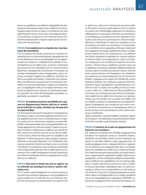 τίωση της πρόσβασης των ασθενών εξασφαλίζοντας εξοικονόμηση οικονομικών πόρων στους ασθενείς και στα συστήματα υγείας σε όλο τον κόσμο. Η τοποθέτησή μας στον όμιλο Novartis είναι να είναι ηγέτες στα διαφοροποιημένα σκευάσματα, με δέσμευση στην ποιότητα έχοντας ταυτόχρονα παγκόσμια θέση επιρροής προκειμένου να επιτύχουμε στην αποστολή μας. P.M & E: Για τα προϊόντα και τις υπηρεσίες σας, ποια στρατηγική θα ακολουθήστε; Γ.Σ: Τα προϊόντα της Sandoz εγγυώνται την ποιότητα που απαιτείται ώστε να είναι αποτελεσματικά, προσφέροντας έτσι και στο θεράποντα που τα συνταγογραφεί και στο φαρμακοποιό που τα διακινεί, τη βεβαιότητα ότι επέλεξαν τη σωστή θεραπεία για τον ασθενή τους. Συνεπώς η στρατηγική μας έγκειται στο να υποστηρίξει αυτή την ποιοτική επιλογή θεραπείας, προσφέροντας επιστημονική υποστήριξη και επίκαιρη πληροφόρηση στους επαγγελματίες υγείας, πάντα με επίκεντρο το όφελος των ασθενών. Επιπλέον της δικής μας ομάδας σαν Sandoz, η στρατηγική μας περιλαμβάνει και στρατηγικές συμμαχίες για την επιτυχημένη προώθηση της συνεχώς αυξανόμενης γκάμας των προϊόντων μας. Συνεργαζόμαστε ήδη με ένα αριθμό ελληνικών εταιρειών στις θεραπευτικές περιοχές της ουρολογίας (καρκίνος προστάτη και στυτική δυσλειτουργία), ογκολογίας, νεφρολογίας, ψυχιατρικής, νευρολογίας... P.M & E: Τα γενόσημα αποτελούν μια διέξοδο για τη μείωση της Φαρμακευτικής δαπάνης αλλά και το «κλειδί» για την ανάπτυξη της υγείας. Αναλύστε μας σύντομα αυτό το σημαντικό θέμα. Γ.Σ: Στη σημερινή οικονομική συγκυρία των περιορισμένων οικονομικών πόρων, τα γενόσημα φάρμακα αποτελούν χωρίς αμφιβολία μία λύση, ώστε να διατηρήσουμε τις παροχές υγείας από την πολιτεία και συγχρόνως να απελευθερωθούν οικονομικοί πόροι ώστε να χρηματοδοτηθούν καινοτόμα φάρμακα στην ελληνική αγορά. Η χρήση των γενοσήμων επιτρέπει τη θεραπεία των ασθενών με προσιτό κόστος, τόσο για την πολιτεία, όσο και για τον ίδιο τον ασθενή και συνεπώς οδηγεί στη διεύρυνση της πρόσβασης στη θεραπεία. Οι εξοικονομούμενοι πόροι μπορούν να χρηματοδοτήσουν καινοτόμες θεραπείες. Στην Ελλάδα δεν είναι ευρέως κατανοητό το διπλό αυτό όφελος και ως συνέπεια η διείσδυση των γενοσήμων είναι σημαντικά χαμηλότερη από τον Ευρωπαϊκό μέσο όρο. Με την ορθή χρήση των γενοσήμων και την ορθή πληροφόρηση για αυτά, αναμένουμε και τη θετική ανταπόκριση τόσο των επαγγελματιών υγείας, όσο και των ασθενών. P.M & E: Ποια κατά την άποψη σας είναι τα «φρένα» για την ανάπτυξη των γενοσήμων και ποιοι οι «μοχλοί» ανάπτυξης τους; Γ.Σ: Η ευρεία παραπληροφόρηση του κοινού σχετικά με τον ρόλο των γενοσήμων φαρμάκων, είναι αναμφίβολα το κύριο εμπόδιο για την ανάπτυξή τους στην Ελληνική αγορά. Εάν στοχεύουμε στη μεγιστοποίηση των οφελών από