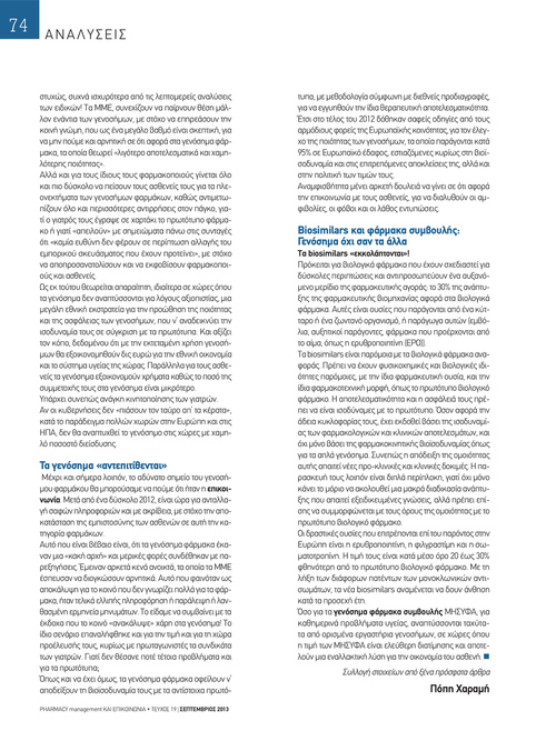 Μέχρι και σήμερα λοιπόν, το αδύνατο σημείο του γενοσήμου φαρμάκου θα μπορούσαμε να πούμε ότι ήταν η επικοινωνία. Μετά από ένα δύσκολο 2012, είναι ώρα για ανταλλαγή σαφών πληροφοριών και με ακρίβεια, με στόχο την αποκατάσταση της εμπιστοσύνης των ασθενών σε αυτή την κατηγορία φαρμάκων. Αυτό που είναι βέβαιο είναι, ότι τα γενόσημα φάρμακα έκαναν μια «κακή αρχή» και μερικές φορές συνδέθηκαν με παρεξηγήσεις. Έμειναν αρκετά κενά ανοικτά, τα οποία τα ΜΜΕ έσπευσαν να διογκώσουν αρνητικά. Αυτό που φαινόταν ως αποκάλυψη για το κοινό που δεν γνωρίζει πολλά για τα φάρμακα, ήταν τελικά ελλιπής πληροφόρηση ή παράλειψη ή λανθασμένη ερμηνεία μηνυμάτων. Το είδαμε να συμβαίνει με τα έκδοχα που το κοινό «ανακάλυψε» χάρη στα γενόσημα! Το ίδιο σενάριο επαναλήφθηκε και για την τιμή και για τη χώρα προέλευσής τους, κυρίως με πρωταγωνιστές τα συνδικάτα των γιατρών. Γιατί δεν θέσανε ποτέ τέτοια προβλήματα και για τα πρωτότυπα; Όπως και να έχει όμως, τα γενόσημα φάρμακα οφείλουν ν’ αποδείξουν τη βιοϊσοδυναμία τους με τα αντίστοιχα πρωτόPHARMACY management KAI EΠΙΚΟΙΝΩΝΙΑ • ΤΕΥΧΟΣ 19 | ΣΕΠΤΕΜΒΡΙΟΣ 2013