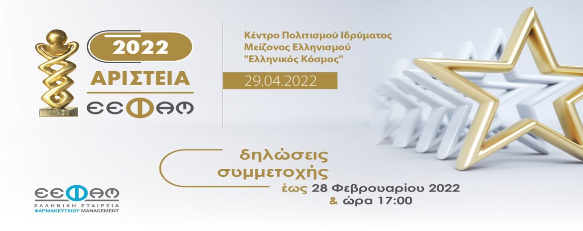 Η τελετή απονομής των Αριστείων Ε.Ε.Φα.Μ. 2022 θα διεξαχθεί την Παρασκευή, 29 Απριλίου 2022 στο Κέντρο Πολιτισμού του Ιδρύματος Μείζονος Ελληνισμού «Ελληνικός Κόσμος», αποτελώντας την κορύφωση του 13ου Συνεδρίου Φαρμακευτικού Management.