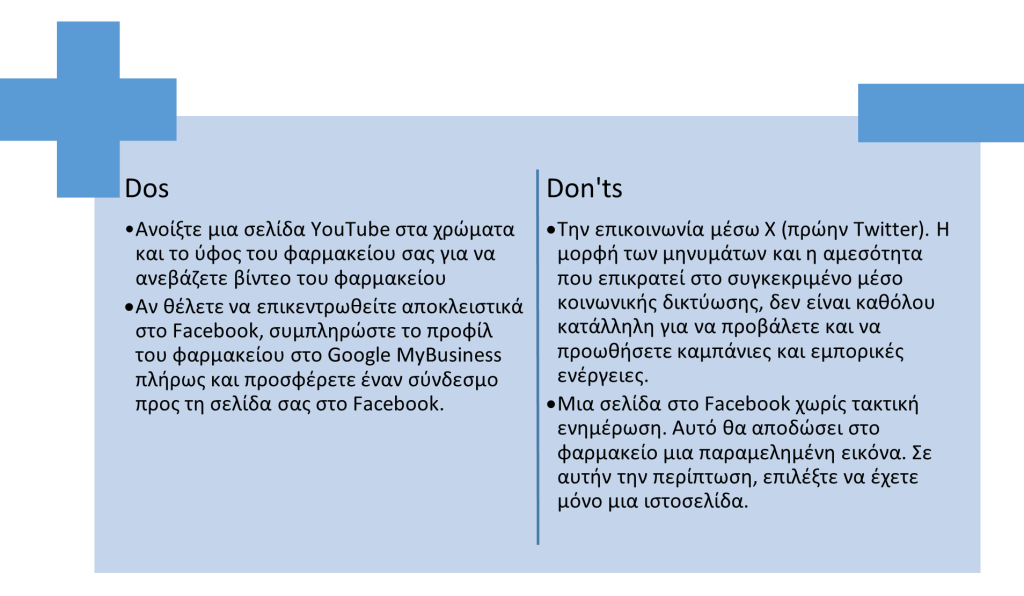 Αλλά αν θέλετε να επικεντρωθείτε στη προοπτική αλληλεπίδρασης με πελάτες εκτός του φυσικού χώρου του φαρμακείου, τότε το Facebook είναι η κατάλληλη επιλογή.