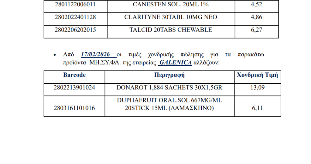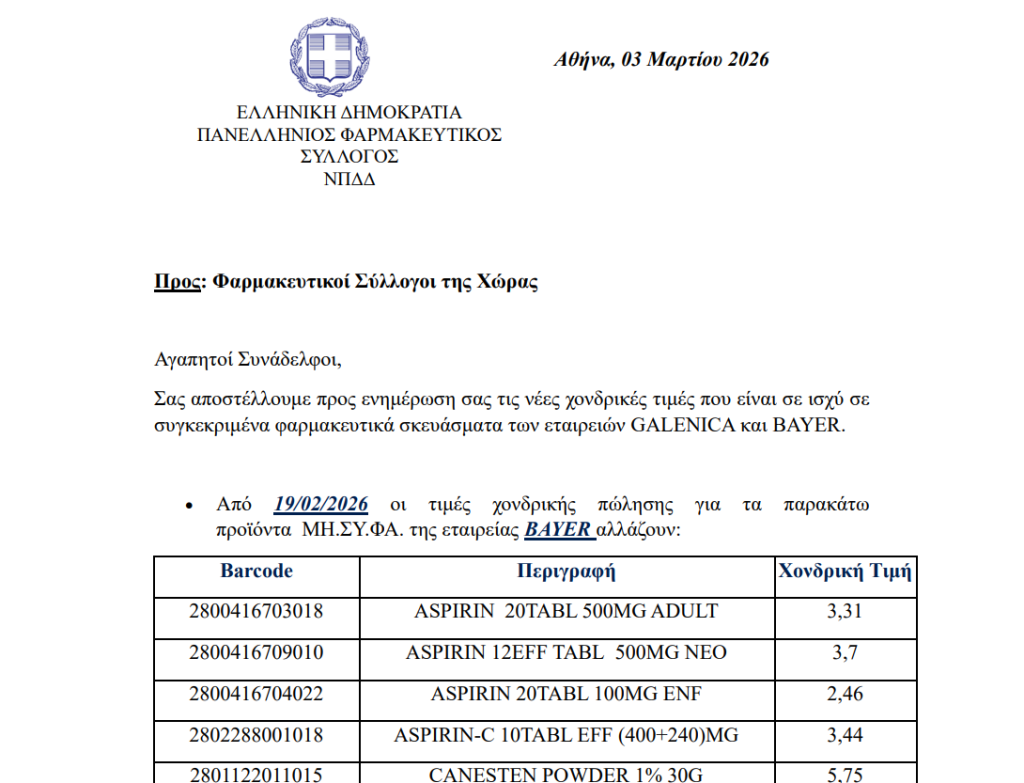 Αρχική » Νέες χονδρικές τιμές σε συγκεκριμένα φαρμακευτικά σκευάσματα των εταιρειών GALENICA και BAYER