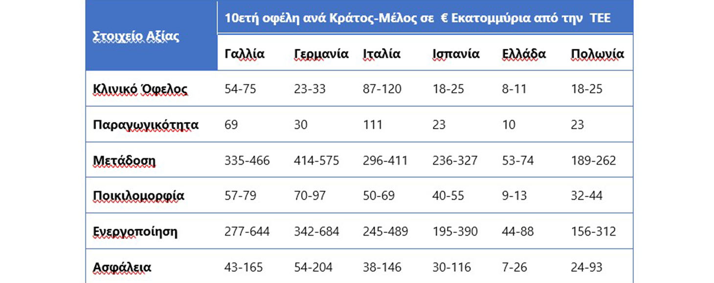 Σύμφωνα με την ανάλυση κόστους/ωφελείας που έγινε για λογαριασμό της EFPIA για πρώτη φορά ποσοτικοποιούνται τα καθαρά θετικά οφέλη που μπορεί να παράσχει η ΤΕΕ.