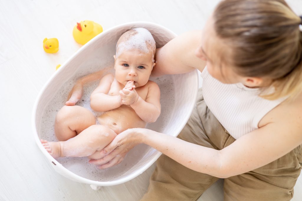 - Κατ’ αρχάς με σκοπό τη σωστή υγιεινή, ένα μπάνιο κάθε δεύτερη μέρα είναι αρκετό. Εάν το δέρμα είναι ερεθισμένο (έκζεμα κ.λπ.), καλό είναι να μην διαρκέσει το μπάνιο πέρα από τα δέκα λεπτά. Συνιστώνται προϊόντα ειδικά σχεδιασμένα για βρέφη, τα οποία σέβονται τόσο το ευαίσθητο δέρμα τους, όσο και τους κανονισμούς που διέπουν τη σύνθεση των καλλυντικών προϊόντων, διασφαλίζοντας έτσι την ακίνδυνη χρήση τους. Συνιστώνται προϊόντα υγιεινής χωρίς σαπούνι, με ουδέτερο pH, χωρίς άρωμα, χωρίς parabens, χωρίς αλκοόλη, χωρίς θειικά άλατα , υποαλλεργικά, χωρίς να προκαλούν ερεθισμό, τσούξιμο στα μάτια ή δακρύρροια. Καλό είναι στα προϊόντα αυτά να περιέχονται και μαλακτικοί και ενυδατικοί παράγοντες, όπως πανθενόλη ή εκχυλίσματα χαμομηλιού ή βρώμης.